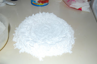 3. Place 3/4 of the powdered sugar on the counter top making a well like structure and dump the bowl of melted marshmallow in the middle.