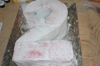 Now cut the cake accordingly and arrange it in number 2. I joined the pieces with the help of butter cream and since the cake was bit heavy i inserted a dowel at the joints.