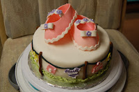 My friend was blessed with a baby girl so we made this cake to welcome them home.It was a 8' classic white cake with butter cream filling and covered in a fondant. Baby shoes and clothes were made from a gum paste.